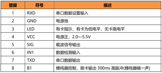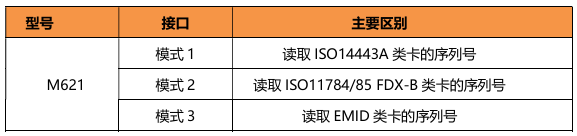 | M621 | (1)UART接口 (2)支持ISO14443A(模式1) (3)支持134.2K(模式2) (4)支持125K(模式3) 特别说明:此芯片只能工作在其中一种模式下,不能三种同时支持 |